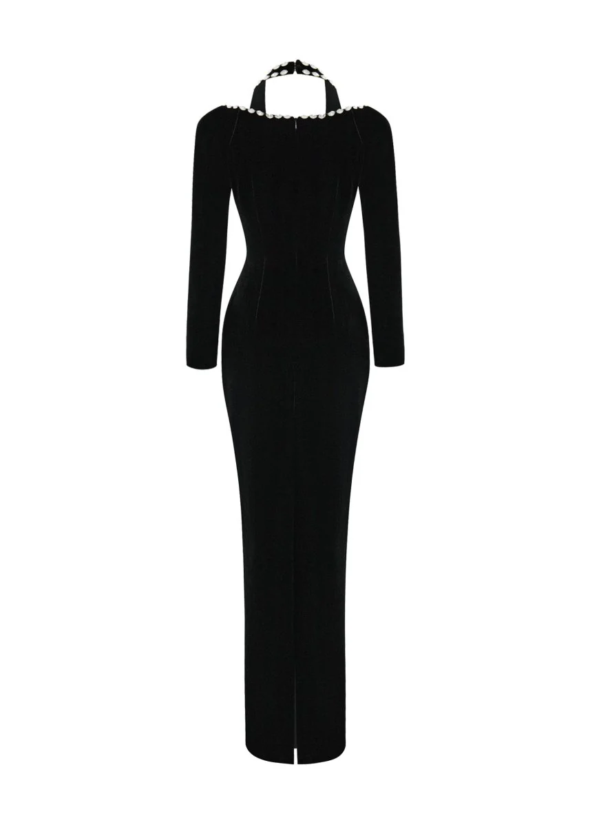 • This maxi dress dazzles with crystal embellishments that frame the décolletage and shoulders. Its fitted silhouette accentuates the figure's curves, while the long sleeves lend an air of elegance. The flowing maxi length elongates the silhouette, enhancing a slimmer, more graceful appearance.