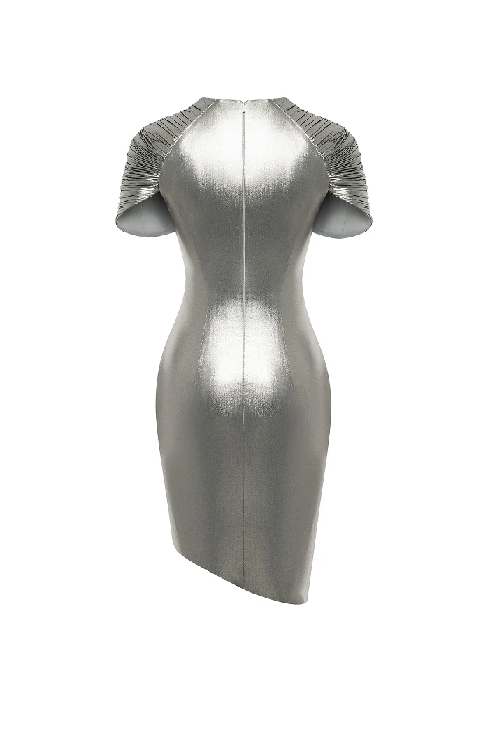 • A mini dress crafted from metallic chiffon that evokes the glow of precious metals. The asymmetrical neckline flows into short sleeves. Intricate draping runs across the entire surface, accentuating the figure and lending the silhouette a sense of architectural structure.