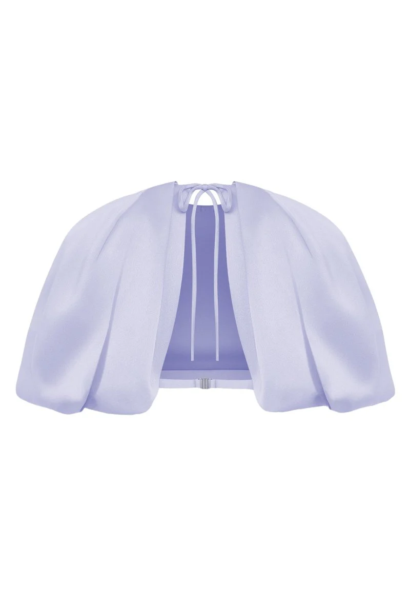 • This cropped satin top captivates with its unique design and elegant lines. The voluminous cut creates a striking silhouette, making it a standout piece in any wardrobe. Adjustable ties at the back ensure a perfect fit and ultimate comfort. Pair it with the velvet midi skirt from the new collection for a harmonious and stylish ensemble.