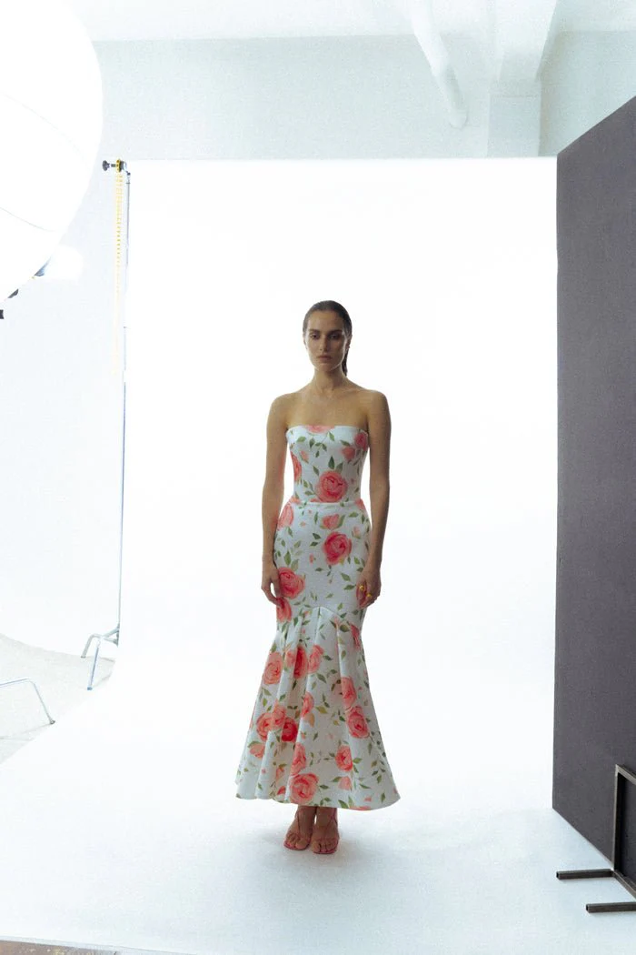 Floral printed satin maxi dress with ruffled skirt