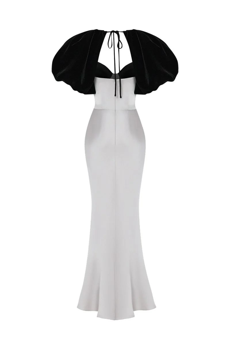 • This maxi dress stands out with its dramatic design and intricate details. The voluminous velvet puff sleeves create a striking accent, drawing attention to the upper part of the dress. The cups of the bodice are adorned with beaded fringe, adding a dynamic touch. The contrast between the velvet top and satin skirt highlights the elegance of the dress. Completing the look is a skirt that flows gracefully downward, forming a feminine mermaid silhouette.
