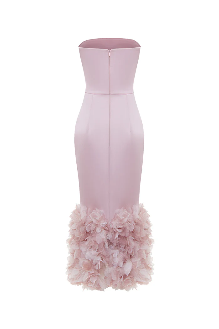 • This satin midi dress is designed to flatter the figure, gracefully highlighting its natural curves. The fitted silhouette exudes timeless elegance, while the hem, adorned with voluminous floral appliqués, adds a touch of charm and whimsy to the look.