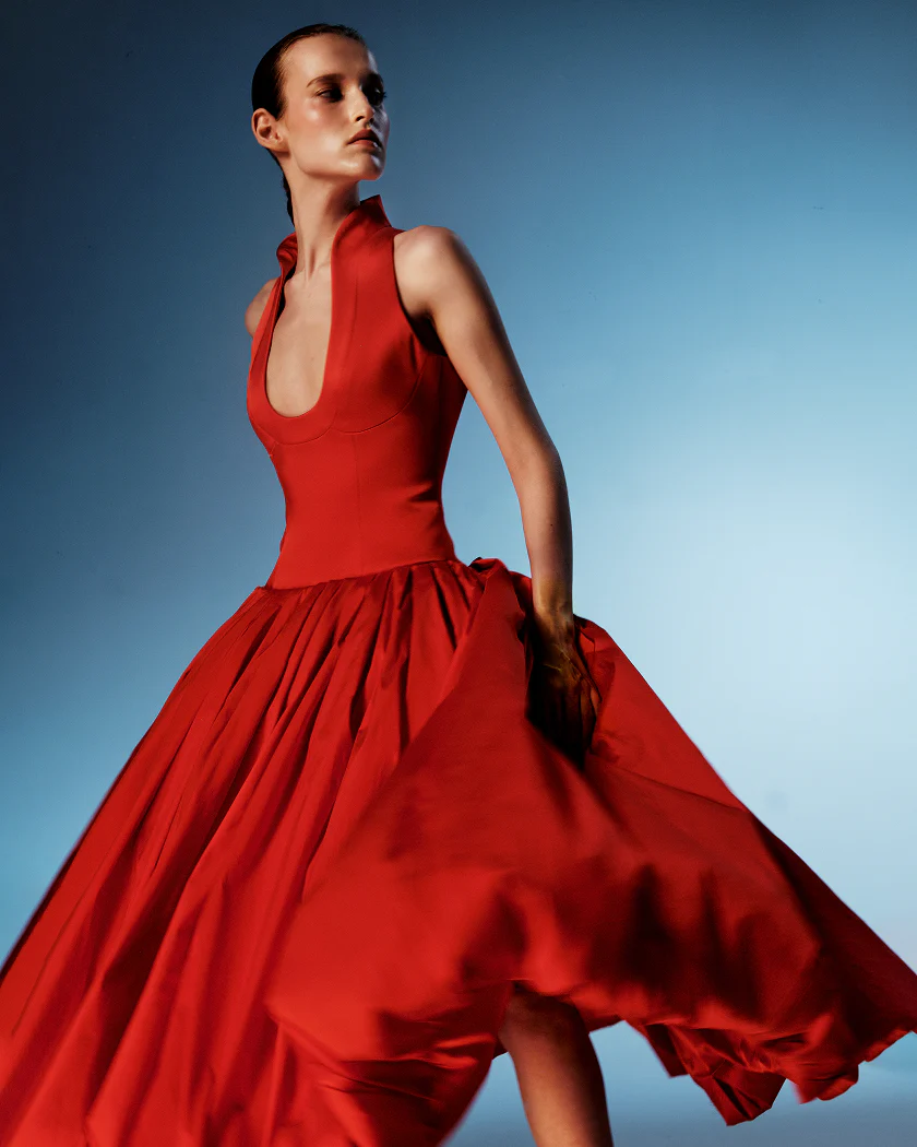 • A midi dress with a smooth satin bodice featuring wide straps and a deep rounded neckline that highlights the décolletage. The fitted silhouette flows into a gathered taffeta skirt. The volume is supported by a structured petticoat that helps maintain the skirt’s shape.